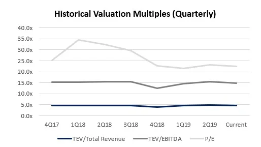 In fact, TEV/Revenue, TEV/EBITDA and P/E multiples have remained relatively consistent. And if anything, they remain at elevated levels when you look at them since 2010. For example and as the chart below shows, the Revenue Multiple has increased from 2.4x in 2010 to 4.6x currently and over the same time period P/E has increased from 16.8x to 22.4x.