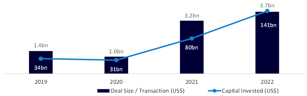 Take-private deal sizes in 2022 have dwarfed prior years, with three of the largest deals amassing a total US$45.5bn deal value. The largest transactions included Citrix Systems, CyrusOne, and McAfee, covering both the Software and IT Services industries. Overall, US$141.8bn has flowed into take-privates in 2022.[6]